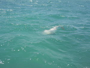 ターポンは3回もジャンプすると必ず針を外されます。あわせが弱すぎとのこと。 写真は相棒がかけた約1.5mくらいのやつ。 4回のジャンプで外されました。 |